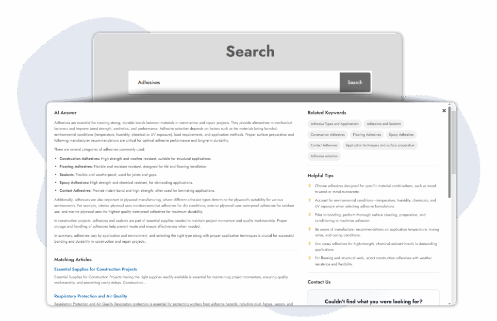 Empower users to explore alternative questions, discover related keywords, or reach out directly via built-in feedback and contact panels.