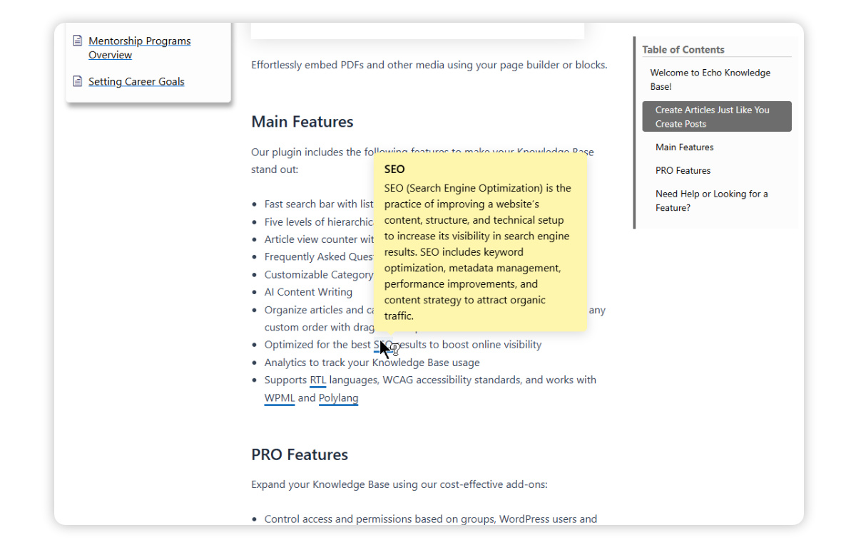 - When readers hover over a highlighted term, a tooltip displays its definition.