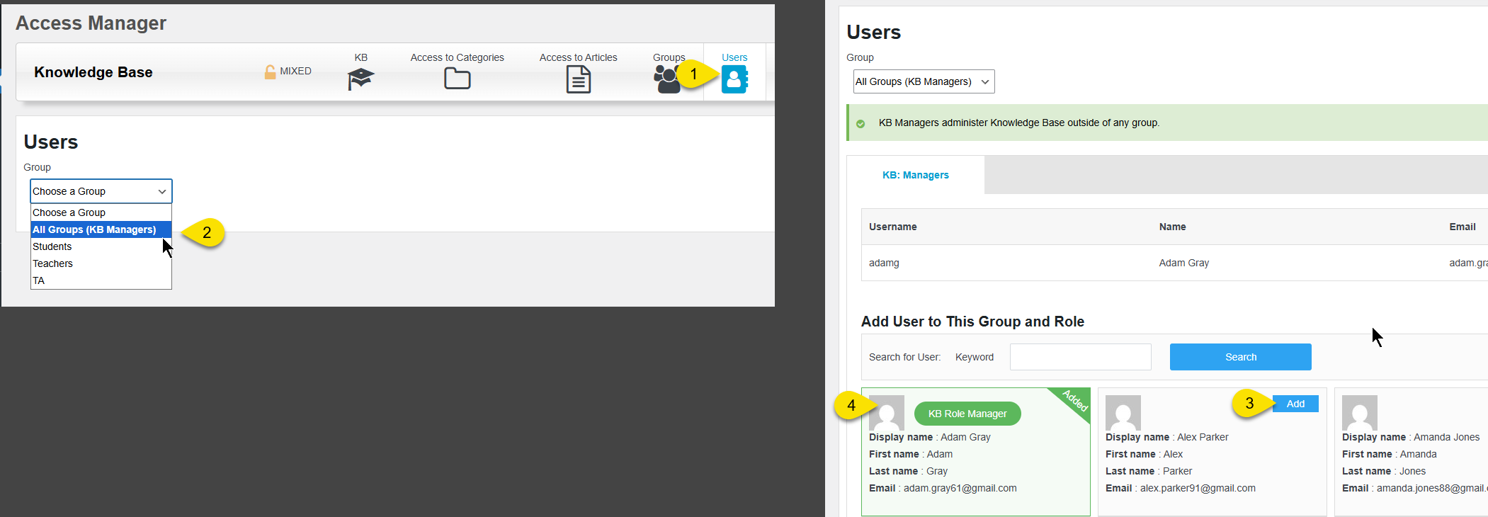 The KB Manager role is assigned through the plugin settings in Access Manager.