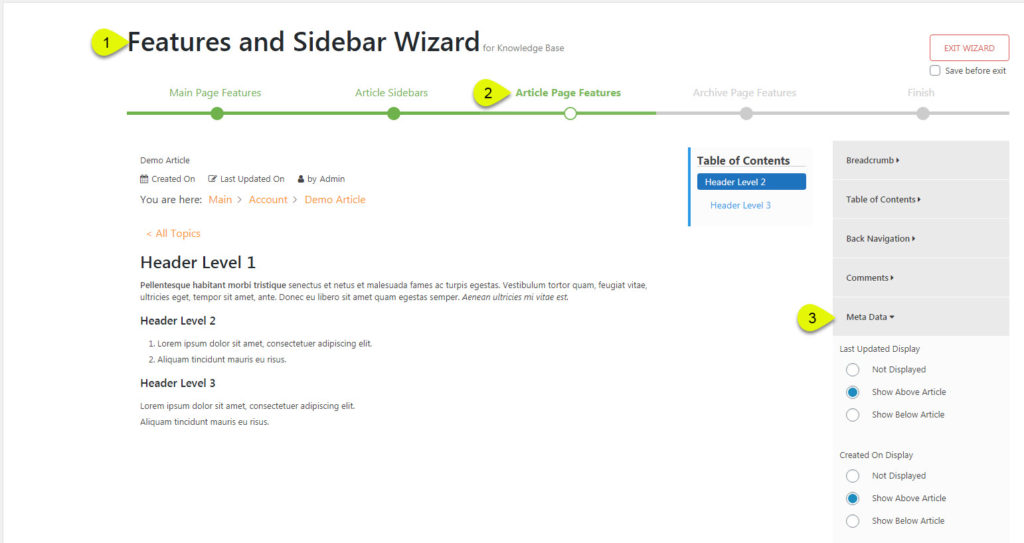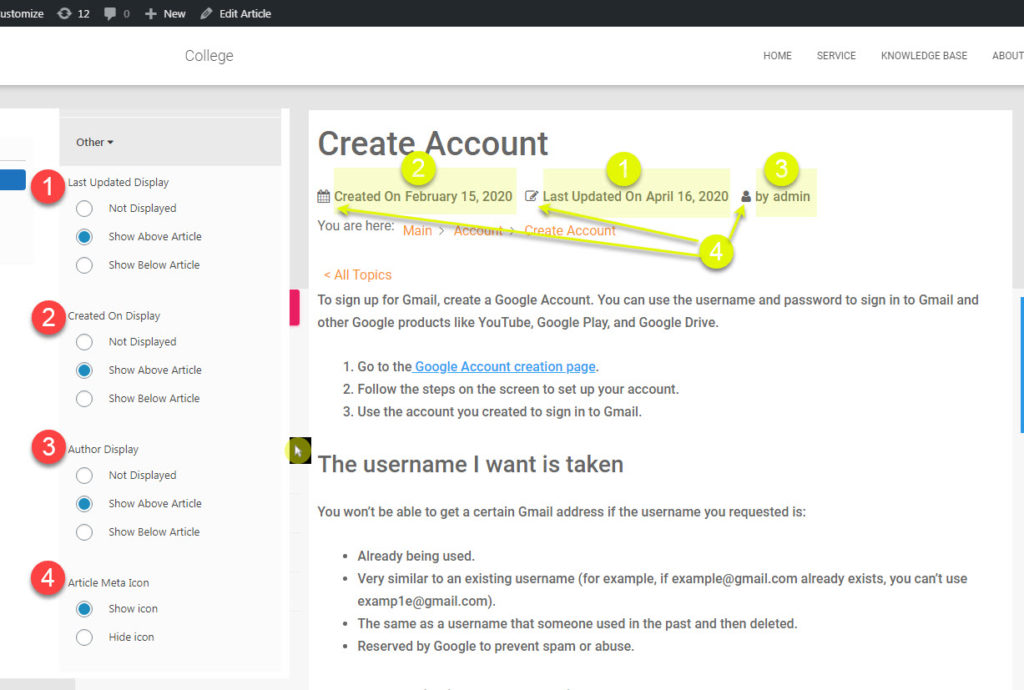 The KB articles have the current available meta data, Created on date, Last updated on date and Author of article. If you have the Ratings add-on it will show rating statistics as well. To edit these follow the instructions below.